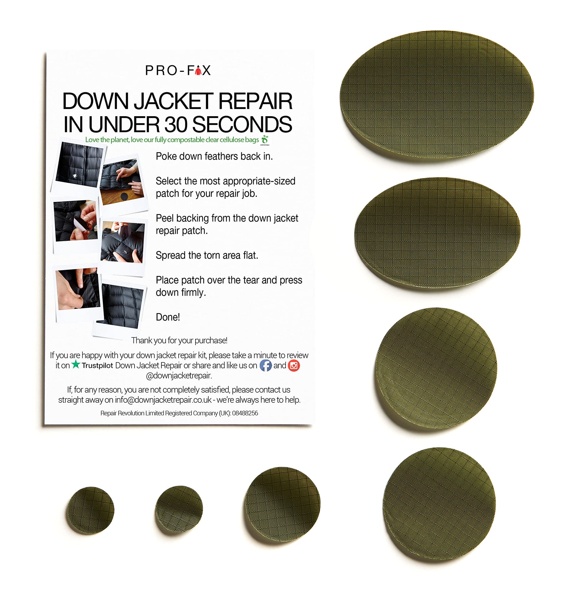 - Original Gear Repair Equipment – Pro-Fix Down Jacket Repair Patches Easy to Use, Pre-Cut, Self-Adhesive, Waterproof, Tear-Resistant Rip-Stop Nylon Fabric Patches for Jackets, Down Jacket Patches - Green Patches (Olive Green) by DJR