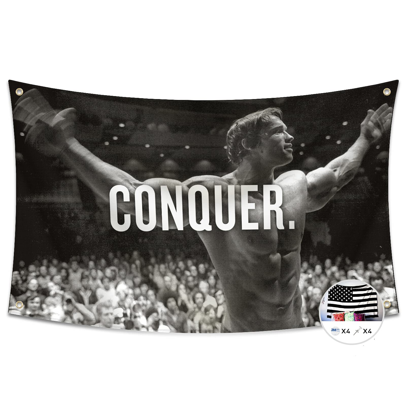 - Original Tapestries – Conquer Flag for Arnold Schwarzenegger 3x5 Ft Gym Motivation Funny Fitness Poster Cool Man Cave Wall Decor for College Dorm Room Decoration,Bedroom,Outdoor,Parties,Gift,Indoor,Ceiling,Garage by Probsin