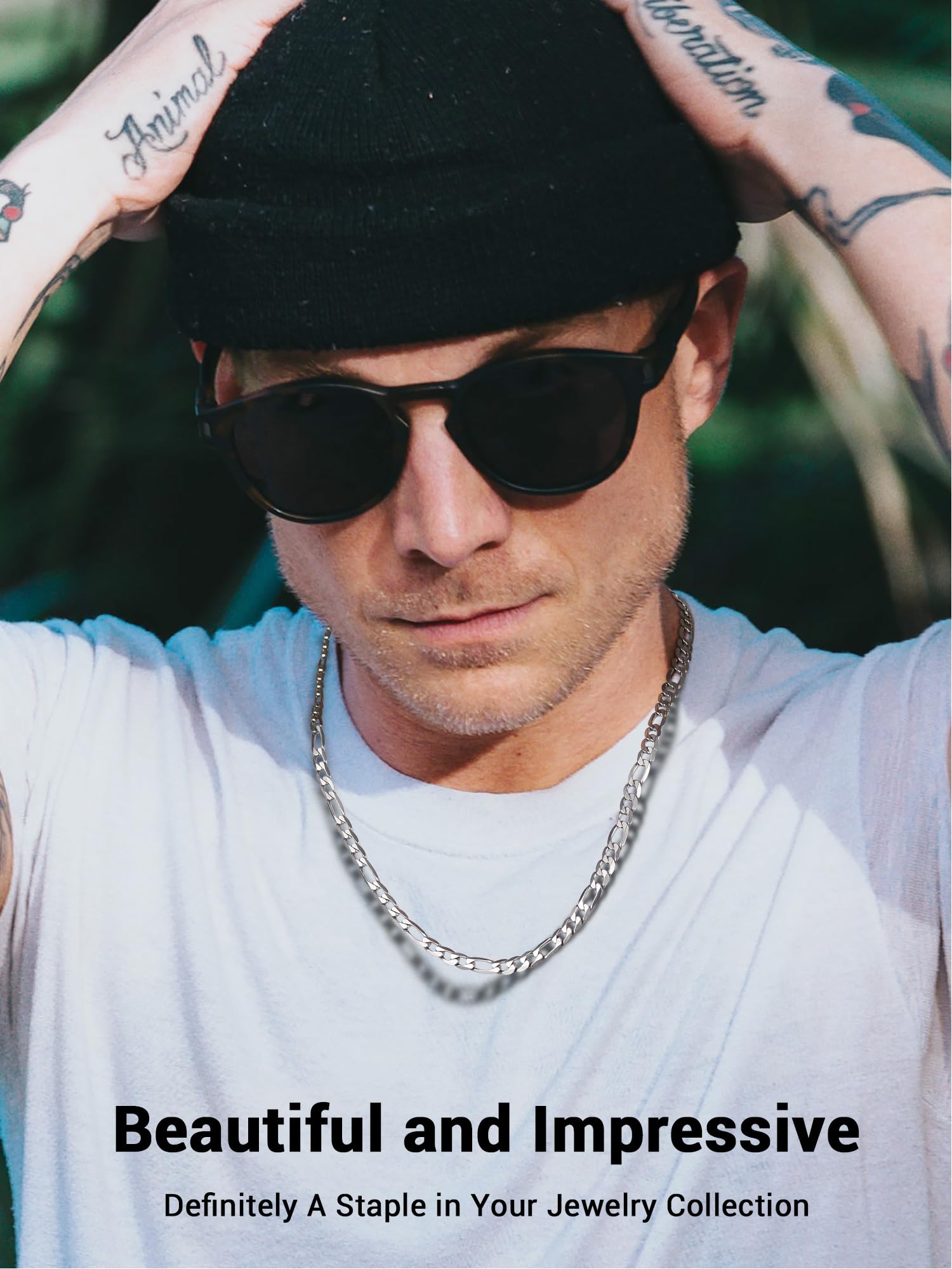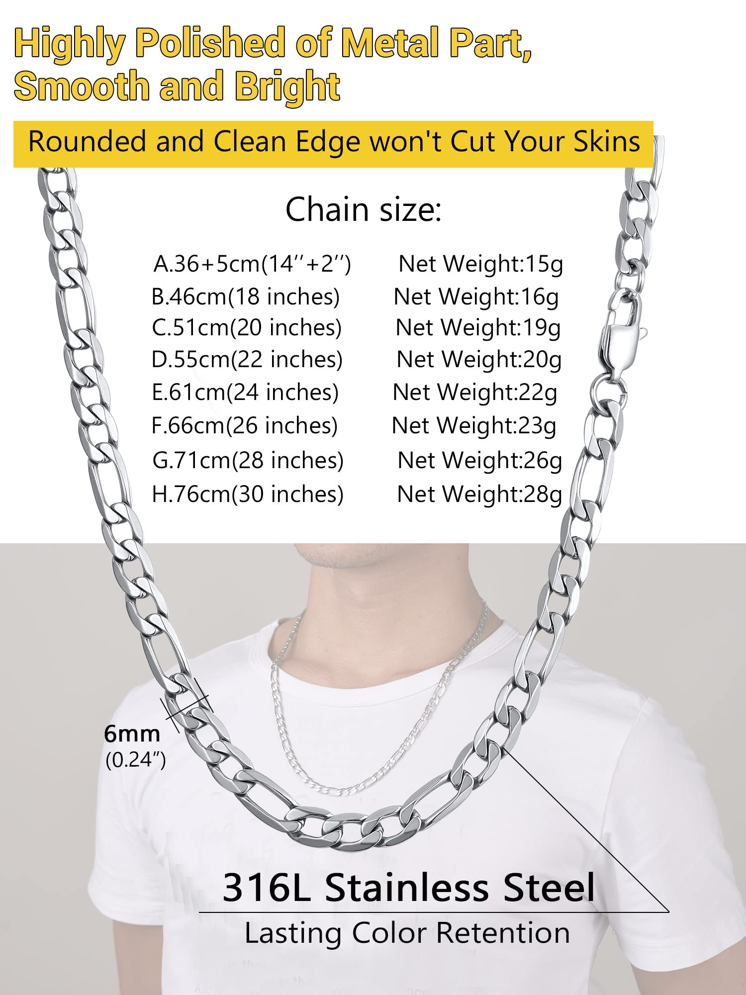 - Necklace: Length: 24 inch, width: 6mm. Very Sturdy Figaro Chain, Smooth Surface, Comfortable Wearing Feeling.