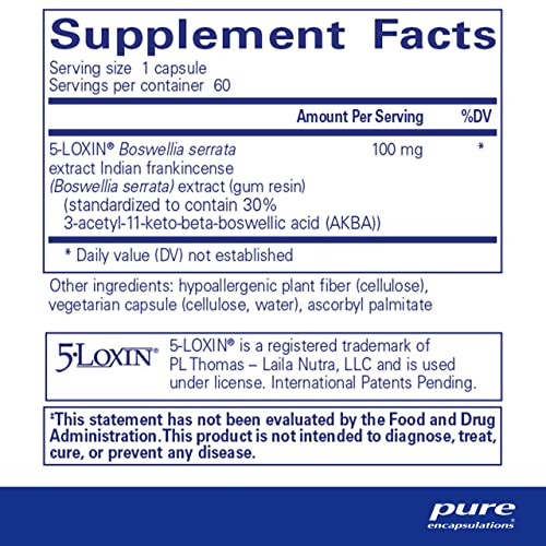 | ingredients | Each serving size (1 capsule) contains: 5-LOXIN Boswellia serrata extract (Indian frankincense gum resin extract) 100 mg. Other ingredients: hypoallergenic plant fiber (cellulose), vegetarian capsule (cellulose, water), ascorbyl palmitate. |