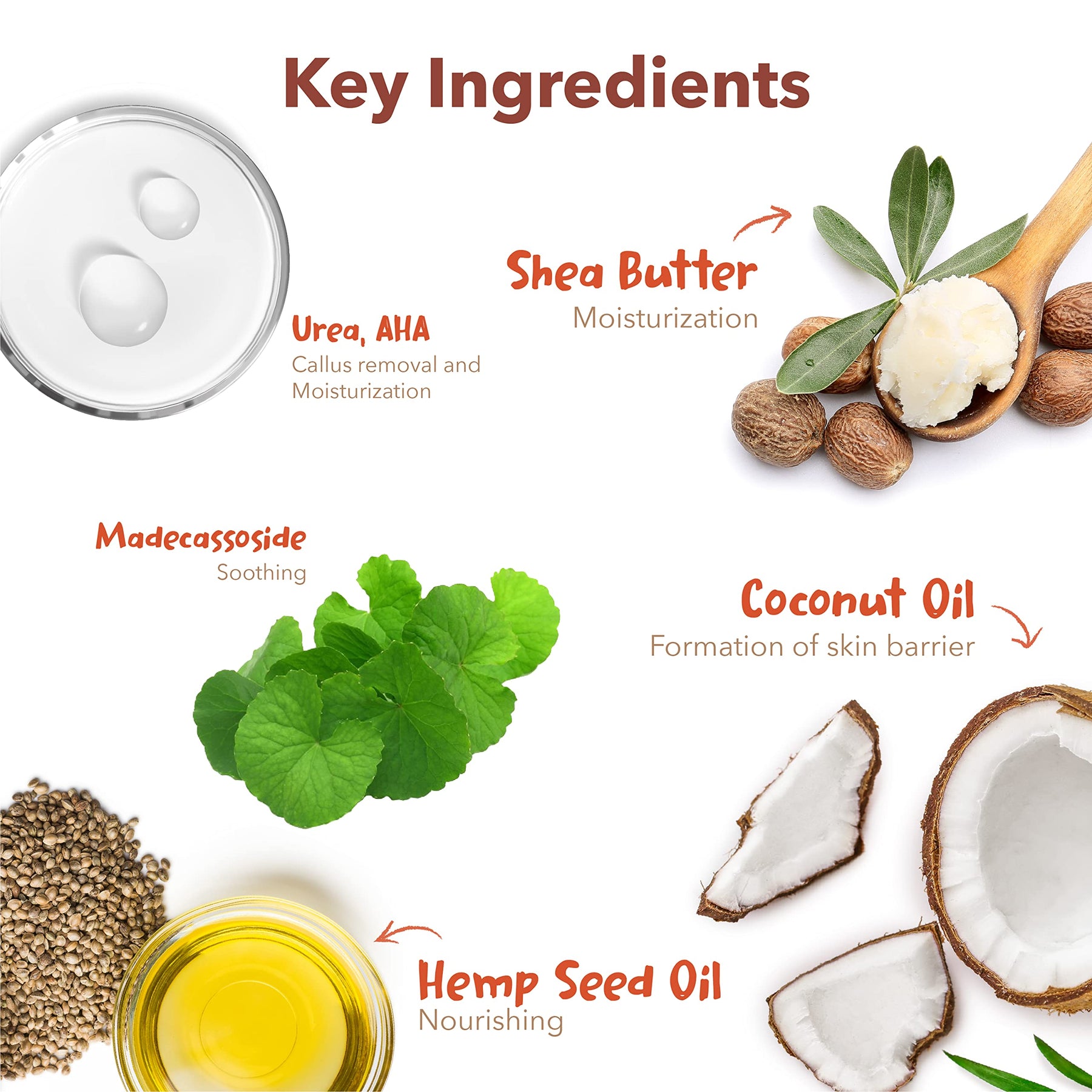 - Urea, Madecassoside, Shea Butter, Coconut Oil and Hemp Seed Oil