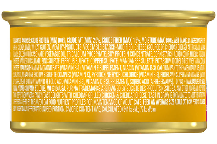 - Take your cat's palate on a culinary adventure with Purina Fancy Feast Delights Grilled Chicken and Cheddar Cheese Feast in Gravy adult wet cat food.