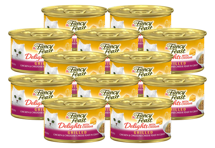 - Original Canned – Delights Canned Wet Cat Food, Grilled Chicken & Cheddar Cheese Feast in Gravy, Gourmet Cat Food for Adult Cats, 3-Ounce Cans (Pack of 12) by PURINA Fancy Feast