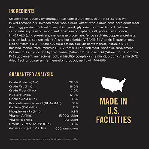 | ingredients | Chicken, Rice, Poultry By-Product Meal, Corn Gluten Meal, Beef Fat Preserved With Mixed-tocopherols, Soybean Meal, Whole Grain Wheat, Whole Grain Corn, Corn Germ Meal, Dried Egg Product, Natural Flavor, Dried Yeast, Glycerin, Fish Meal, Fish Oil, Calcium Carbonate, Soybean Oil, Mono And Dicalcium Phosphate, Salt, Potassium Chloride, Minerals Zinc Proteinate, Manganese Proteinate, Ferrous Sulfate, Copper Proteinate, Calcium Iodate, Sodium Selenite, Choline Chloride, Vitamins Vitamin E Supplement, Niacin (Vitamin B-3), Vitamin A Supplement, Calcium Pantothenate (Vitamin B-5), Thiamine Mononitrate (Vitamin B-1), Vitamin B-12 Supplement, Riboflavin Supplement (Vitamin B-2), Pyridoxine Hydrochloride (Vitamin B-6), Folic Acid (Vitamin B-9), Vitamin D-3 Supplement, Menadione Sodium Bisulfite Complex (Vitamin K), Biotin (Vitamin B-7), Dried Bacillus Coagulans Fermentation Product, Garlic Oil. F448919 |