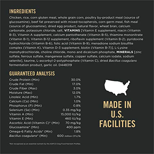 | ingredients | Chicken, Rice, Corn Gluten Meal, Whole Grain Corn, Poultry By-product Meal (Source Of Glucosamine), Beef Fat Preserved With Mixed-tocopherols, Corn Germ Meal, Fish Meal (Source Of Glucosamine), Dried Egg Product, Natural Flavor, Wheat Bran, Calcium Carbonate, Potassium Chloride, Salt, Vitamins (Vitamin E Supplement, Niacin (Vitamin B-3), Vitamin A Supplement, Calcium Pantothenate (Vitamin B-5), Thiamine Mononitrate (Vitamin B-1), Vitamin B-12 Supplement, Riboflavin Supplement (Vitamin B-2), Pyri |