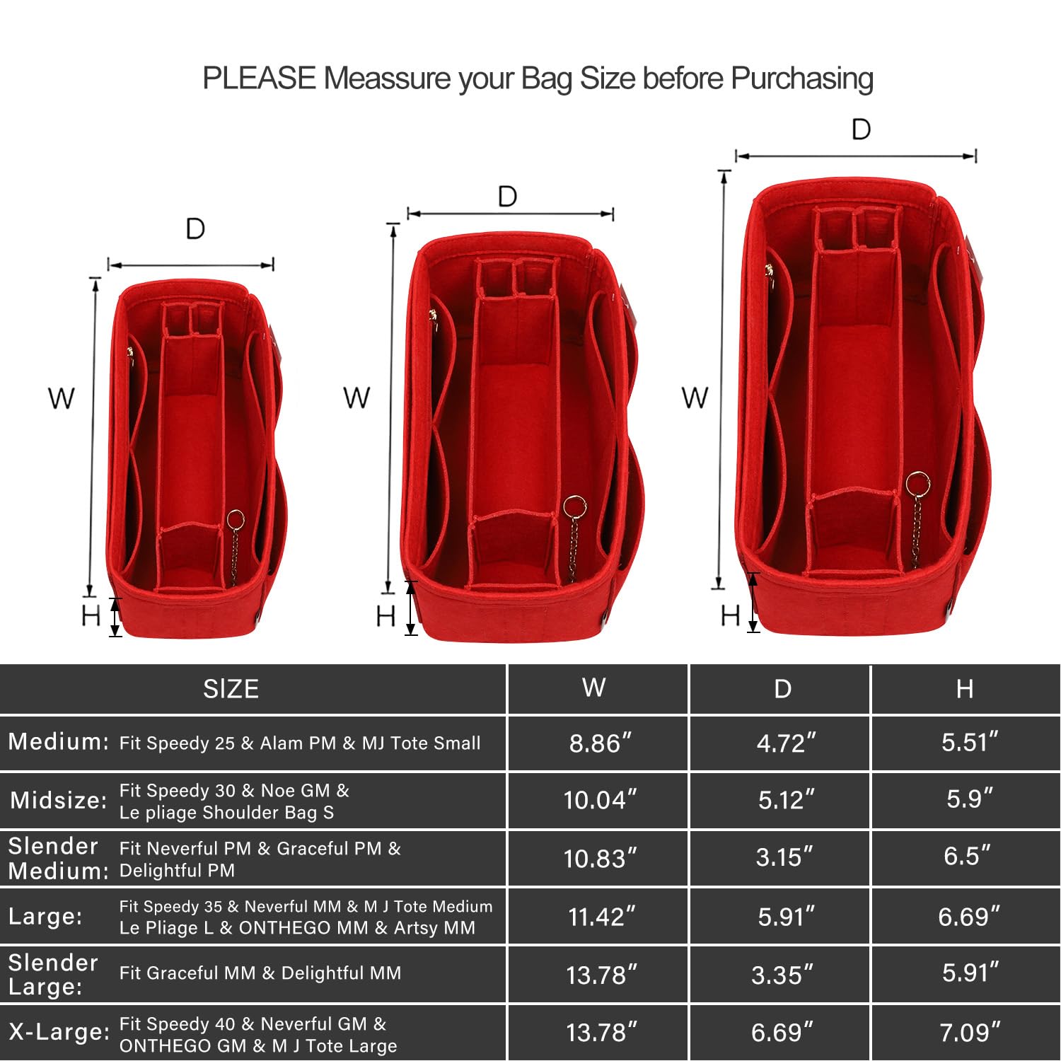- 2: SIZES OF PURSE ORGANIZER:Medium of Purse Organizer: 8.86(W)x 4.72(D)x 5.51(H) inches Fits Speedy 25 perfectly. Large: 11.42(W)x 5.91(D)x 6.69(H) inches Fits Speedy 30 & Speedy 35 and Neverfull MM and Le piage L Perfectly.X-Large:13.78(W)x 6.69(D)x7.09(H) inches fits Speedy 40 and Neverfull GM Perfectly.Slender Medium:10.83(W)x 3.15(D)x6.5(H) Inches Fits Neverful PM and Graceful PM and Delightful PM.Slender Large:13.78(W)x 3.35(D)x5.91(H)Inches Fits Graceful MM Perfectly