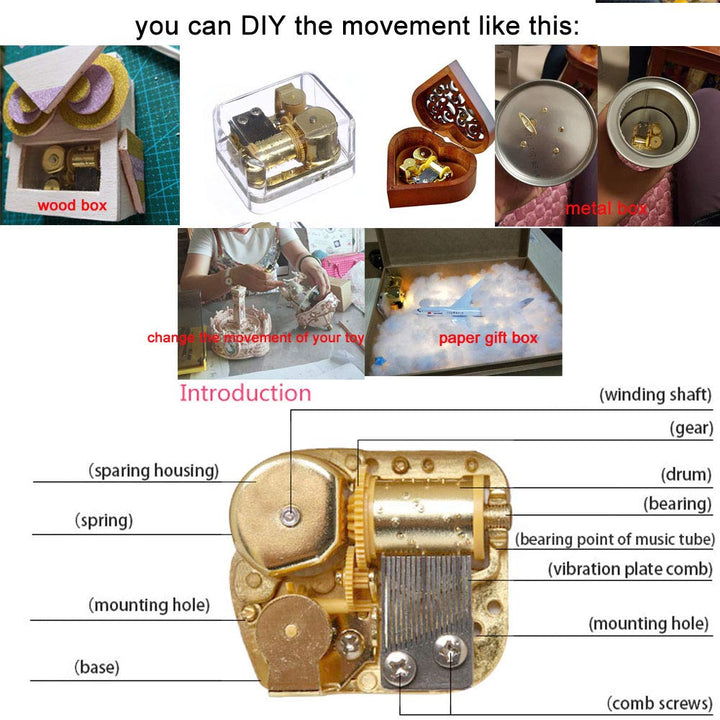 - [For DIY Music Boxes and Gift] - You can install the movement into a DIY box, such as paper box, wooden box, glass box, plastic box and metal box. Or you don't need to put it in a box, just play the movement on the desk, seeing its gears move, listening the pure tune, very interesting! It is also a unique gift for mom, dad, boys, girls, kids, grandma, grandpa, granddaughter, sweetheart, relatives or yourself!