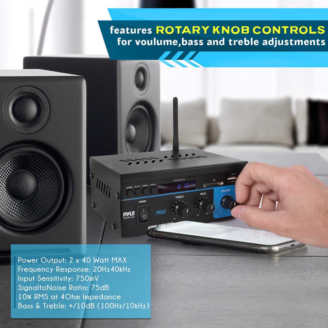 - Original Amplifiers – Home Home Audio Power Amplifier System 2X40W Mini Dual Channel Sound Stereo Receiver Box w/ LED For Amplified Speakers, CD Player, Theater via 3.5mm RCA for Studio, Home Use PCA2 Black by Pyle