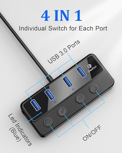 - Blue LED of this usb hub adapter hub shows working status for each port, Individual switch turns off port whenever you don’t need it. Avoid hot-swapping and environmentally friendly, low power consumption to prolong the lifespan of devices