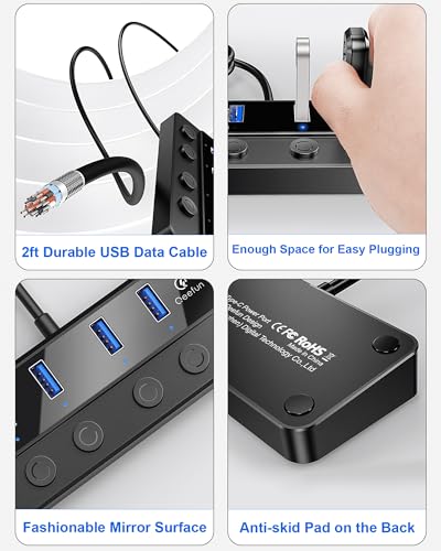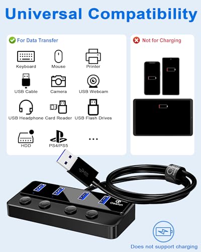 Qeefun 4-Port USB Hub 3.0, Individual LED Power Switches USB Splitter 2ft USB Extender 5V/3A USB Adapter for Laptop, PC, USB Flash Drives, and More