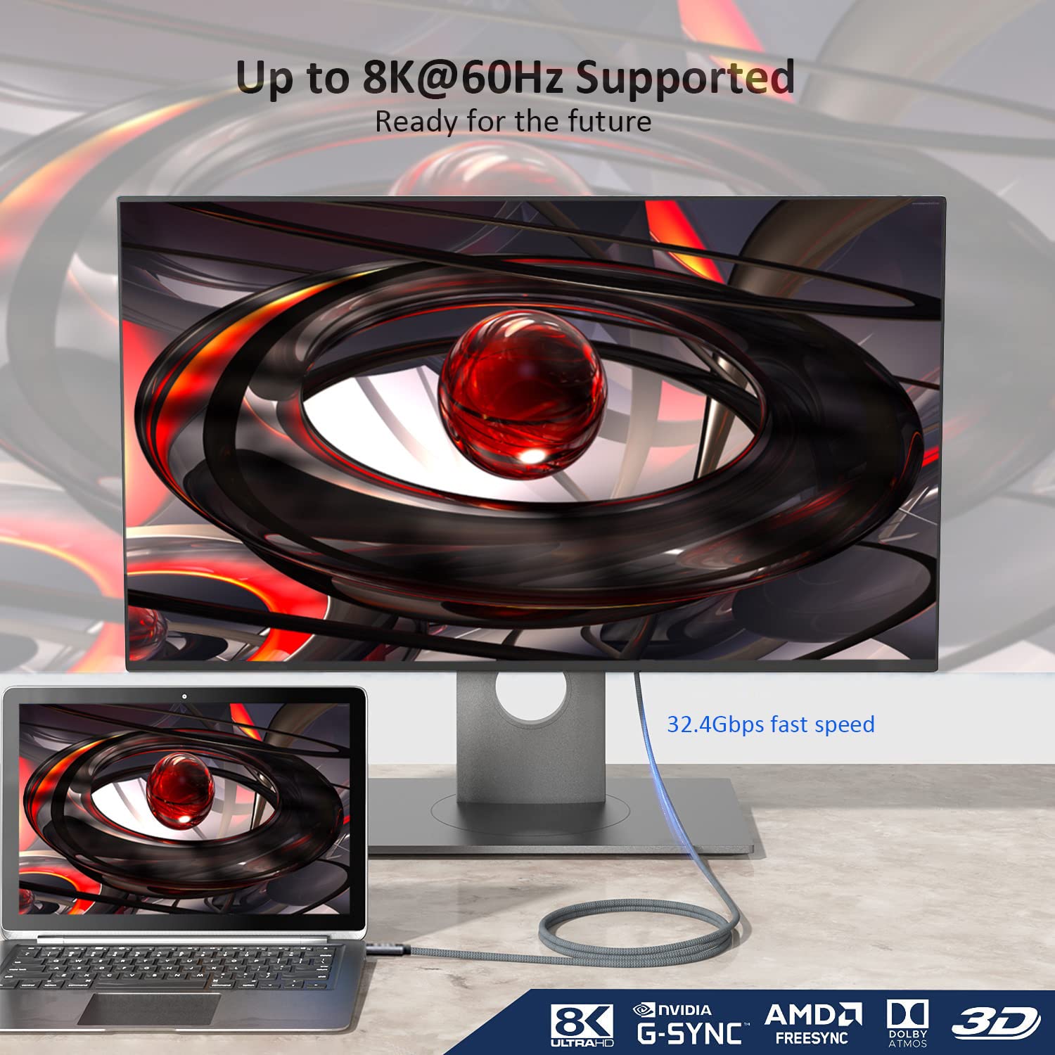 - USB C to DisplayPort 1.4 Cable: Supports resolutions 8K (7680x4320)@60Hz, 5K (5120x2880)@60Hz, 5120x1440@120Hz, 4K(3840x2160)@60Hz/120Hz/144Hz, 2K@120Hz/240Hz. Connect to a bigger screen up to 8K resolution 60hz refresh rate with a stable signal transferring (HDR supported). You will be able to mirror or extend your screen and the cable also works under the clamshell mode.