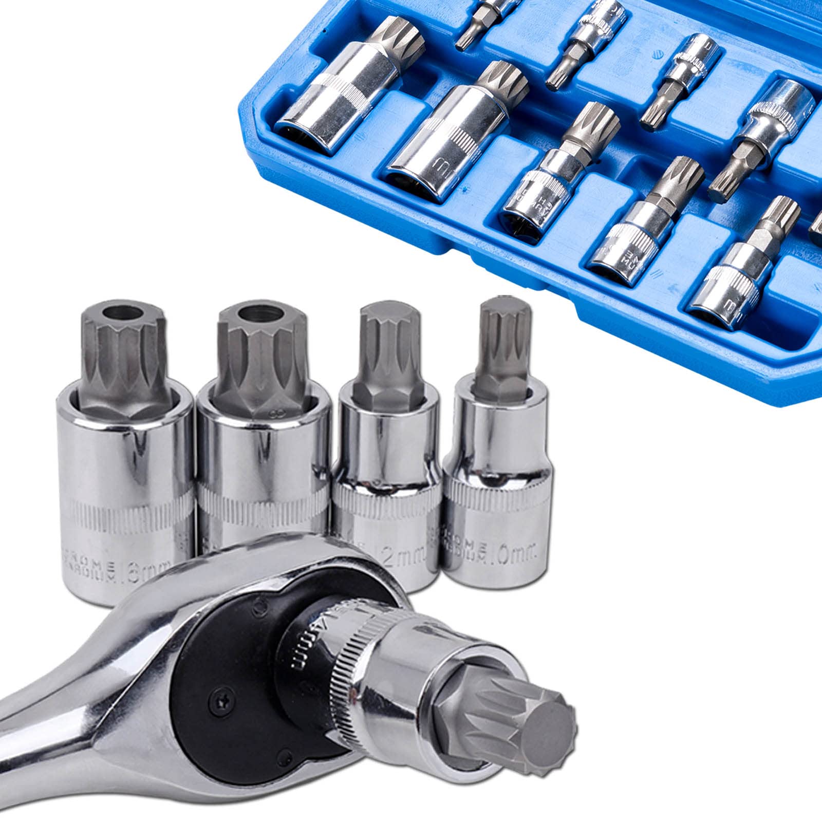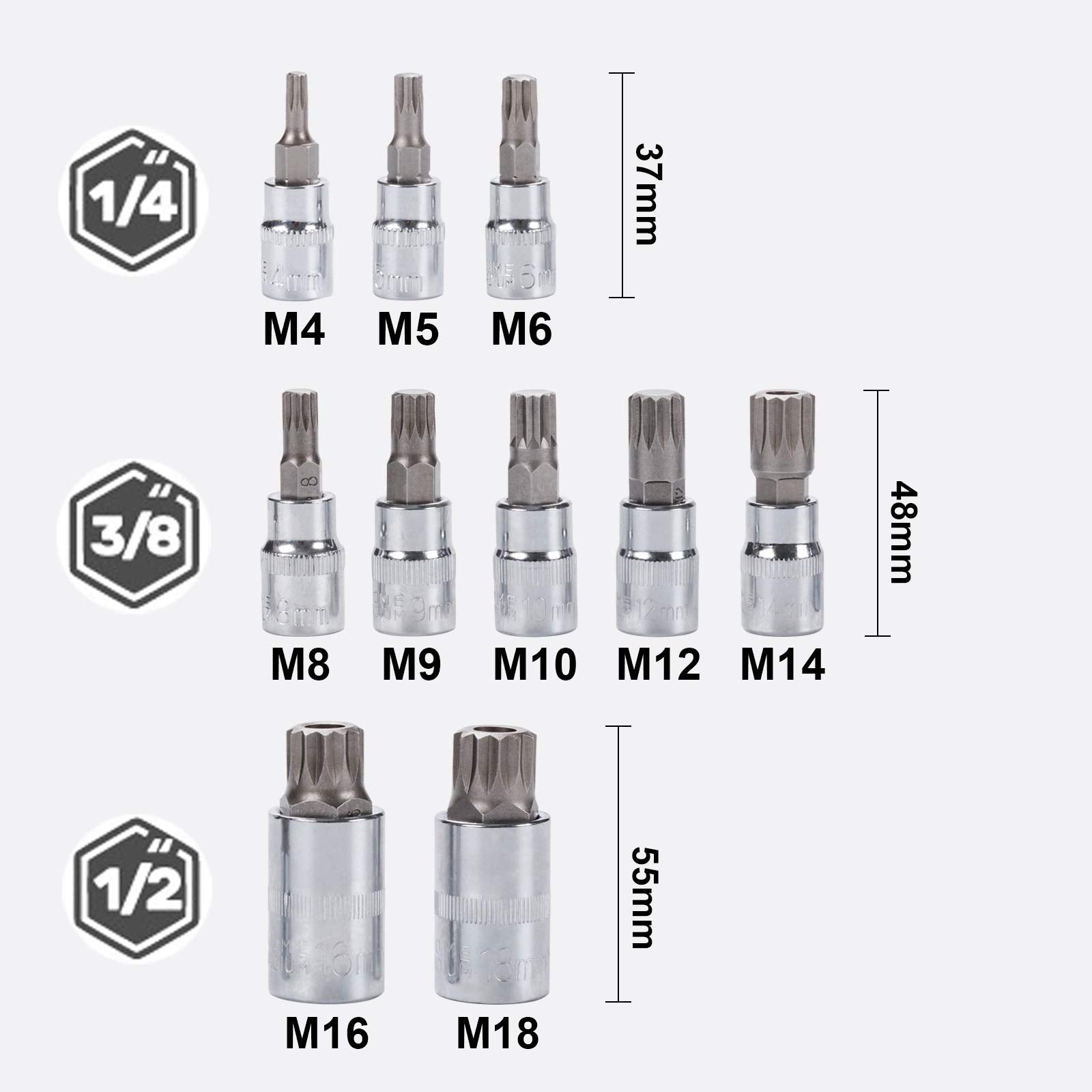 - Spline Bit Socket Set Contents: 1/4” Drive: M4, M5, M6, 3/8” Drive: M8, M9, M10, M12, M14, 1/2” Drive: M16, M18.