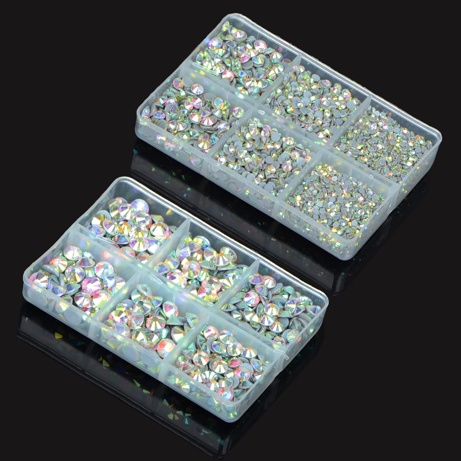 - 5 Sizes clear AB rhinestones come with 2 boxes. SS6 2mm, SS10 2.5mm, SS16 4mm, SS20 4.5mm, SS30 6.5mm. Assorted sizes can more easily realize the design of different styles of various handicrafts, thereby adding brilliance and charm to your handicrafts.