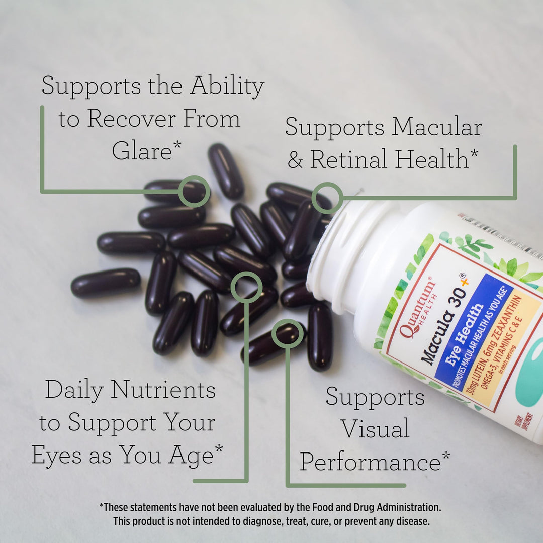 - EASY TO SWALLOW SOFTGELS - Quantum Health Macula 30+ softgel eye supplements for adults are specially created for ease of swallowing. 30 servings per bottle, take 2 softgels daily with food.