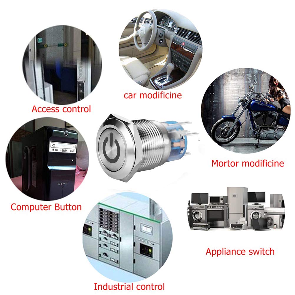 - Original Pushbutton Switches – 19mm 3/4 Latching Pushbutton Switch LED 12V DC 5A Power Symbol ON-OFF Waterproof Toggle Switch Stainless Steel Shell with Wire Connector Plug(Red light) by Quentacy