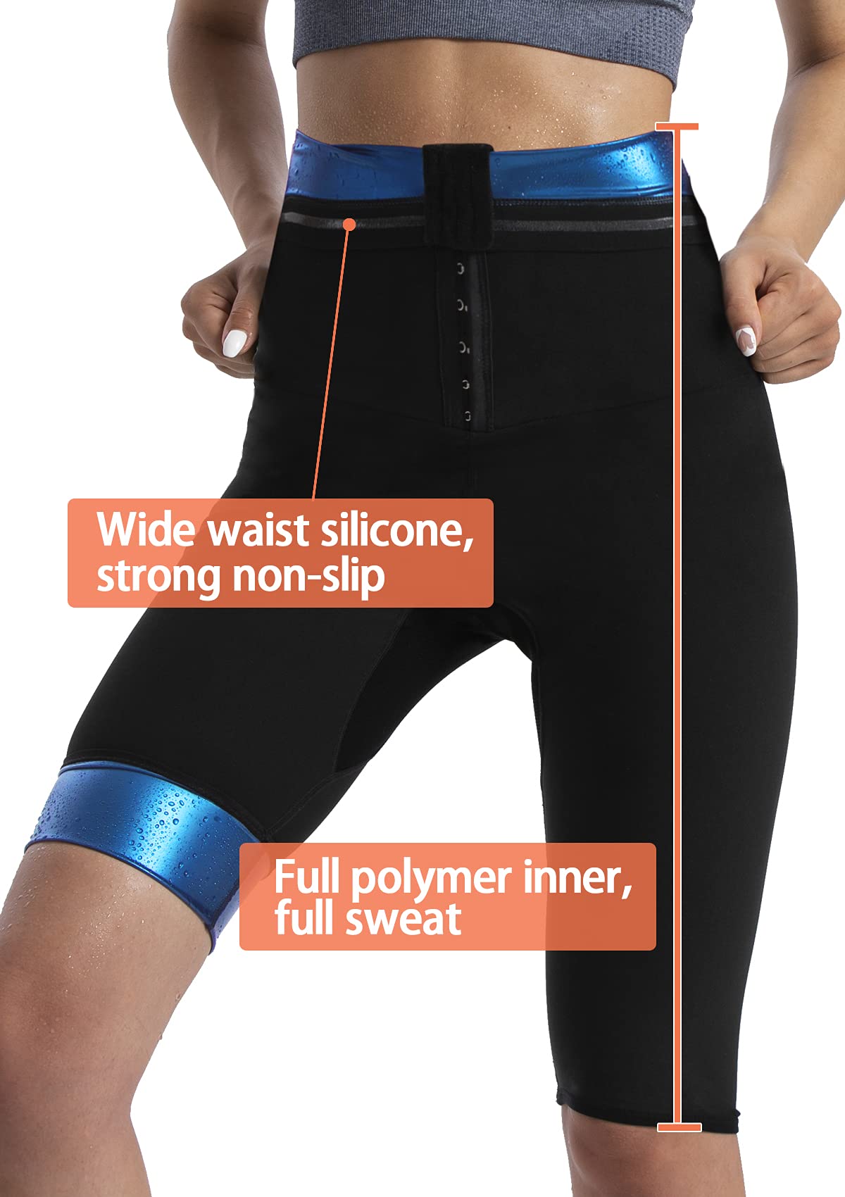 - UPGRADE FEMININE DESIGN:Waist trainer design with adjustable hooks,you can freely adjust the waist, give you the compression effect you want.The back waist of sauna pants has an M-shaped hip lift design,which highlights the charm of women,lengthen your legs visually.We design crotch breathable net-fabric,you can feel no sticky in your lower body during gym training,you won't feel bound in sports.Sweat shorts are designed for different body types,so it’s suitable for both the thin and the fat