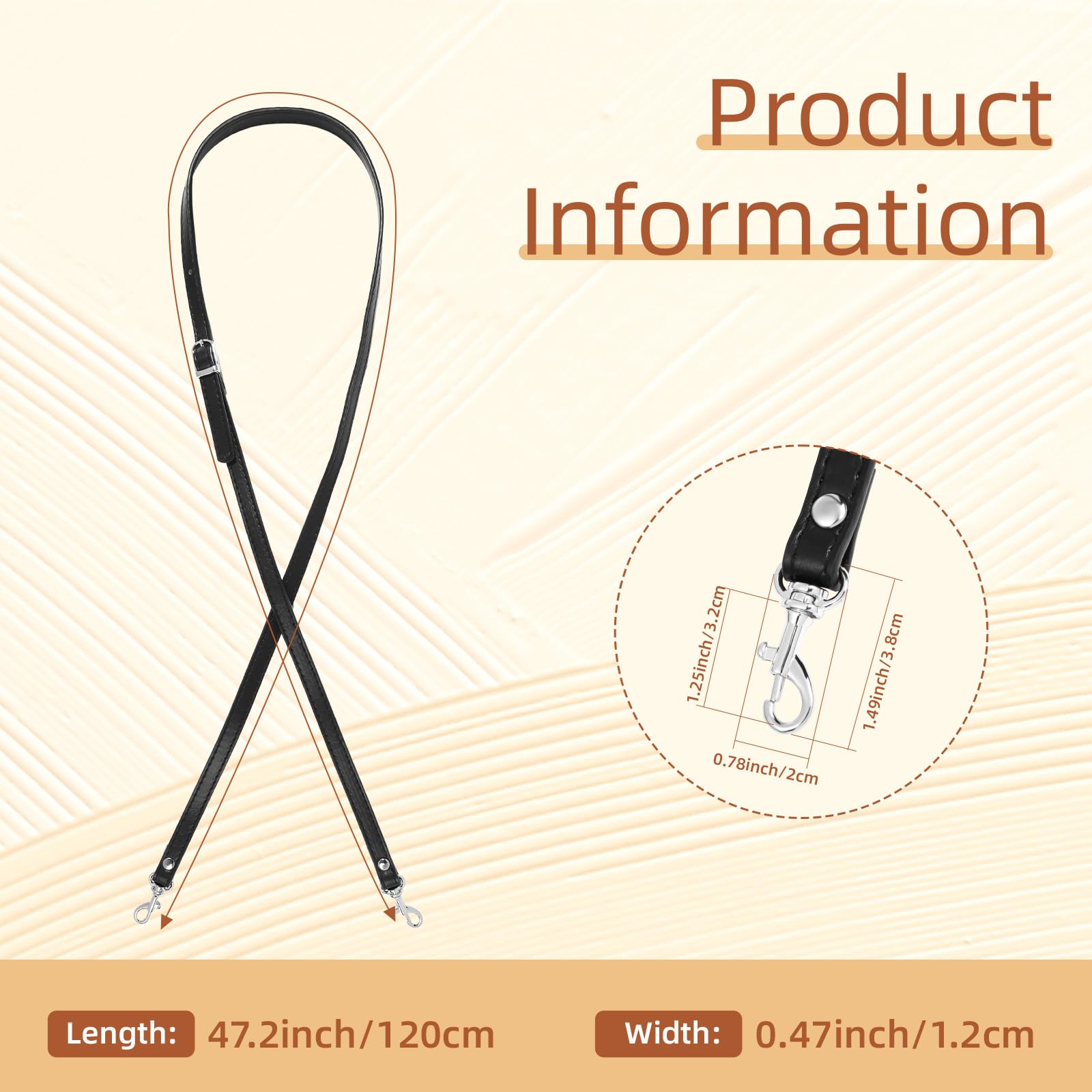 - PU Leather. Durable, and Beautiful leather strap, matches your bag perfectly. Length: 47.2inch/120cm. Width: 0.47/1.2cm