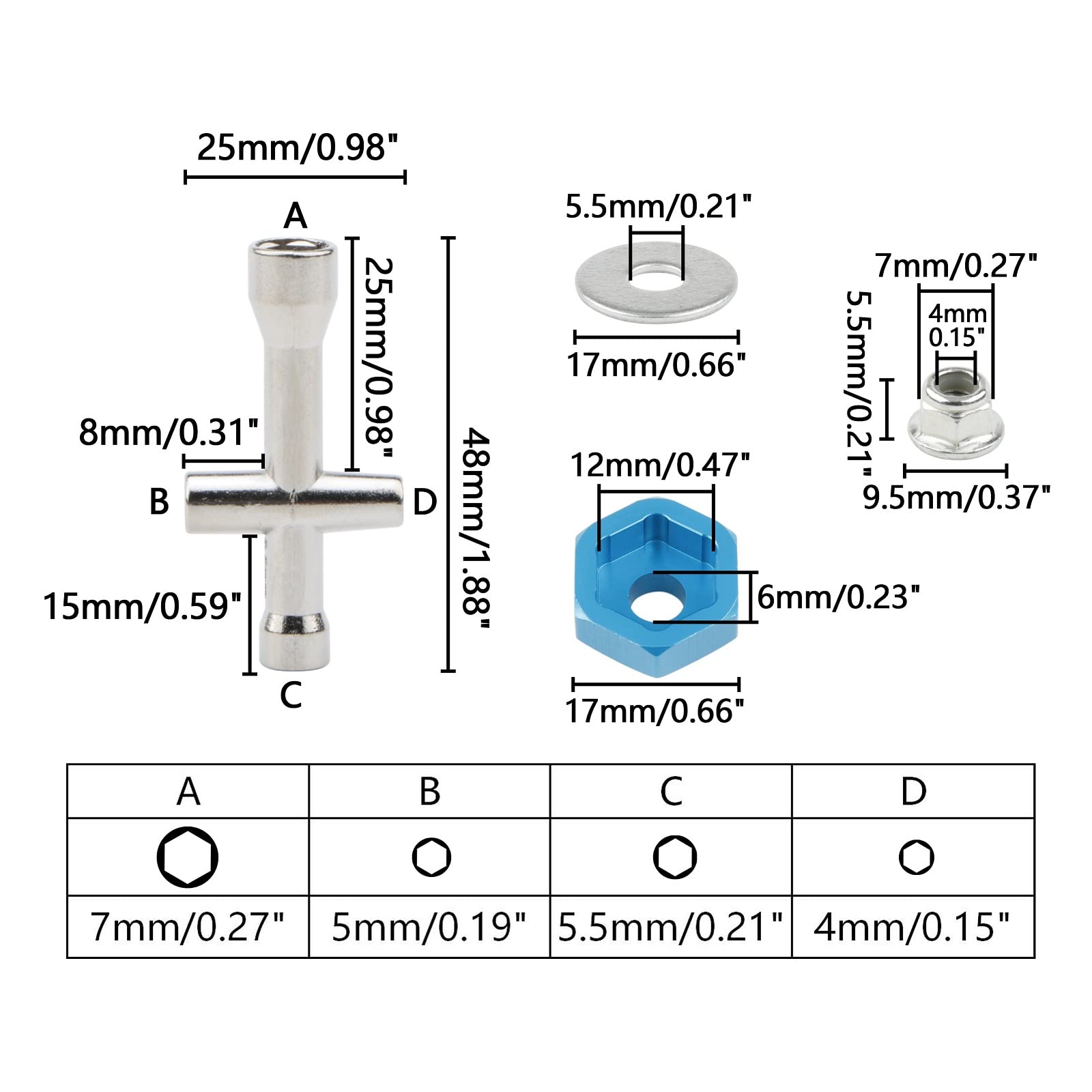 - 4pcs 12mm to 17mm Hex Adapter Converter, Drive Hex Size: 17mm, Thickness: 5mm, Axle Hole Diameter: 6mm; Made of Anodized Aluminum Alloy, Well Machined