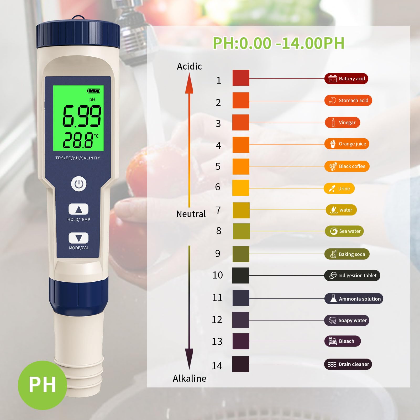 - 5-in-1 PH Meter for Water: The pH meter is designed with a 5-in-1 function, which can measure pH (acidity and alkalinity), TDS (total dissolved solids), EC (conductivity), salinity (salt content), and temperature. Simply press the {MODE/CAL} key to switch the value of pH, EC (uS/cm), TDS (ppm), and salinity (ppm/%).