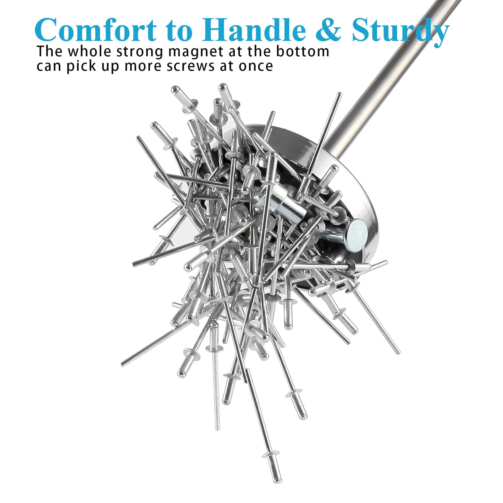 - EASY TO ORPERATE WITH STRONG MAGENET: The whole strong magnet for 35LB pull capacity under our real test can easily pick up nails, screws, and ferrous metal scraps. Long extend handle to 34 can help you reach floor or lawn. The ergonomic easy grip handle designed to fit people's hand makes the sweeping work comfort.