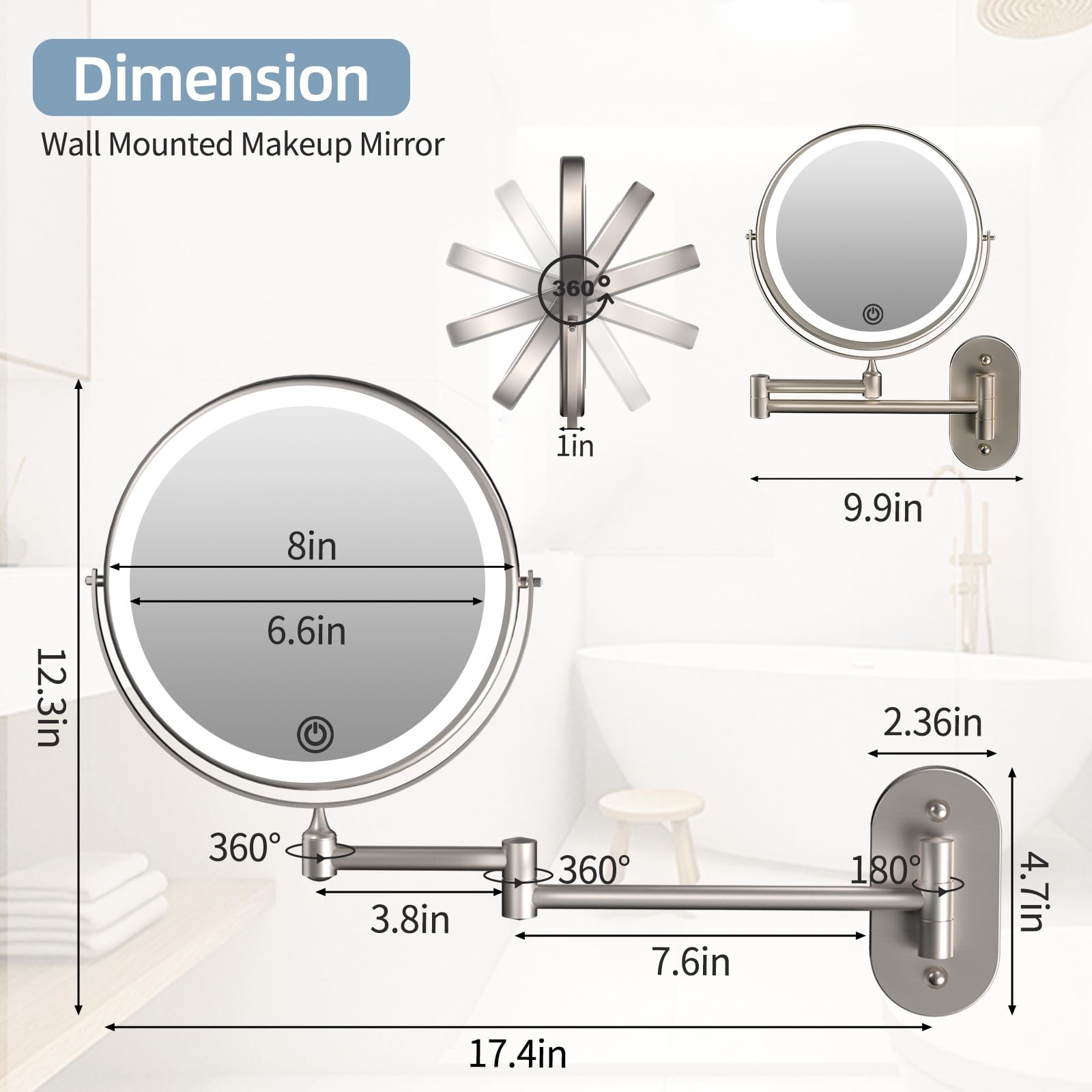- 360°Swivel Extendable Design: The lighted mounted makeup mirror designed with extendable arm joint allow 360-degree rotation, so that you can find your comfort viewing angle to meet your needs in the bathroom for makeup ,squeezing, shaving and wearing contact lenses etc.The bathroom mirrors for wall can be folded against the wall to save space when not in use.