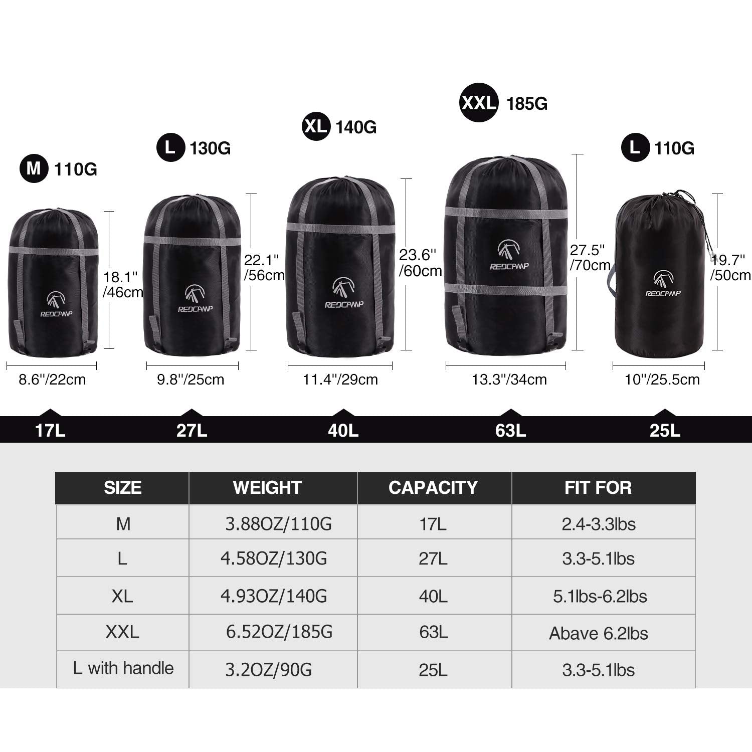 - Original Stuff Sacks – Sleeping Bag Stuff Sack, Compression Sack, Great for Backpacking and Camping Black L by REDCAMP
