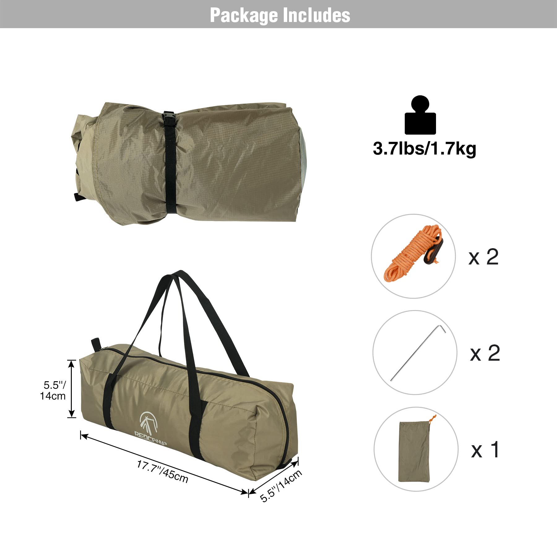 - Package Includes: This set contains awning tent x 1, D3MM wind rope 3.5m x 2; D4 tent nail 18cm x 2; small storage bag x 1; complete set of storage bag x 1. It can be used in camping, RV traveling, off-road adventure, etc.