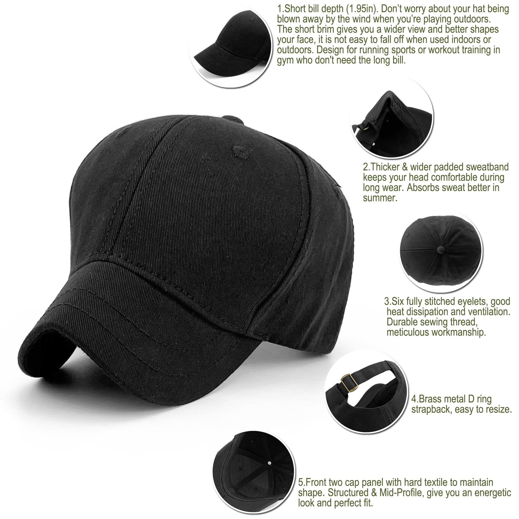 - Unique Short Bill Ball Hat Design 1.97inches/5cm Bill Length, The Brim is Shorter Than a Regular Baseball Cap But Long Enough to Keep Your Eyes From The Sunshine if Necessary, Cool and Cute Short Bill Dad Cap and Frame Your Face Well