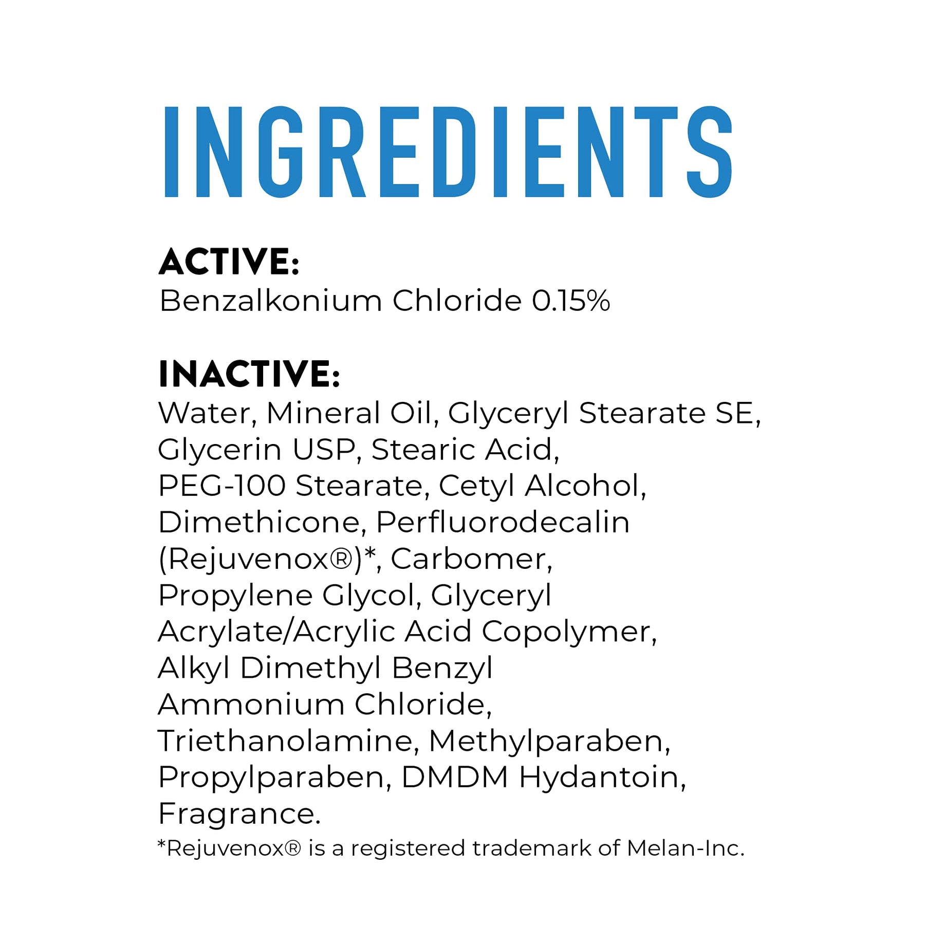 | ingredients | Active Ingredient: Benzalkonium Chloride 0.15% Inactive Ingredients: Water, Mineral Oil, Glyceryl stearate SE, Glycerin USP, Stearic Acid, PEG-100 stearate, Cetyl Alcohol, Dimethicone, Rejuvenox (perfluorodecalin), Carbomer, Propylene glycol, Gylceryl polymethacrylate, Triethanolamine, Phenoxethanol, Ethylhexyl glycerin |