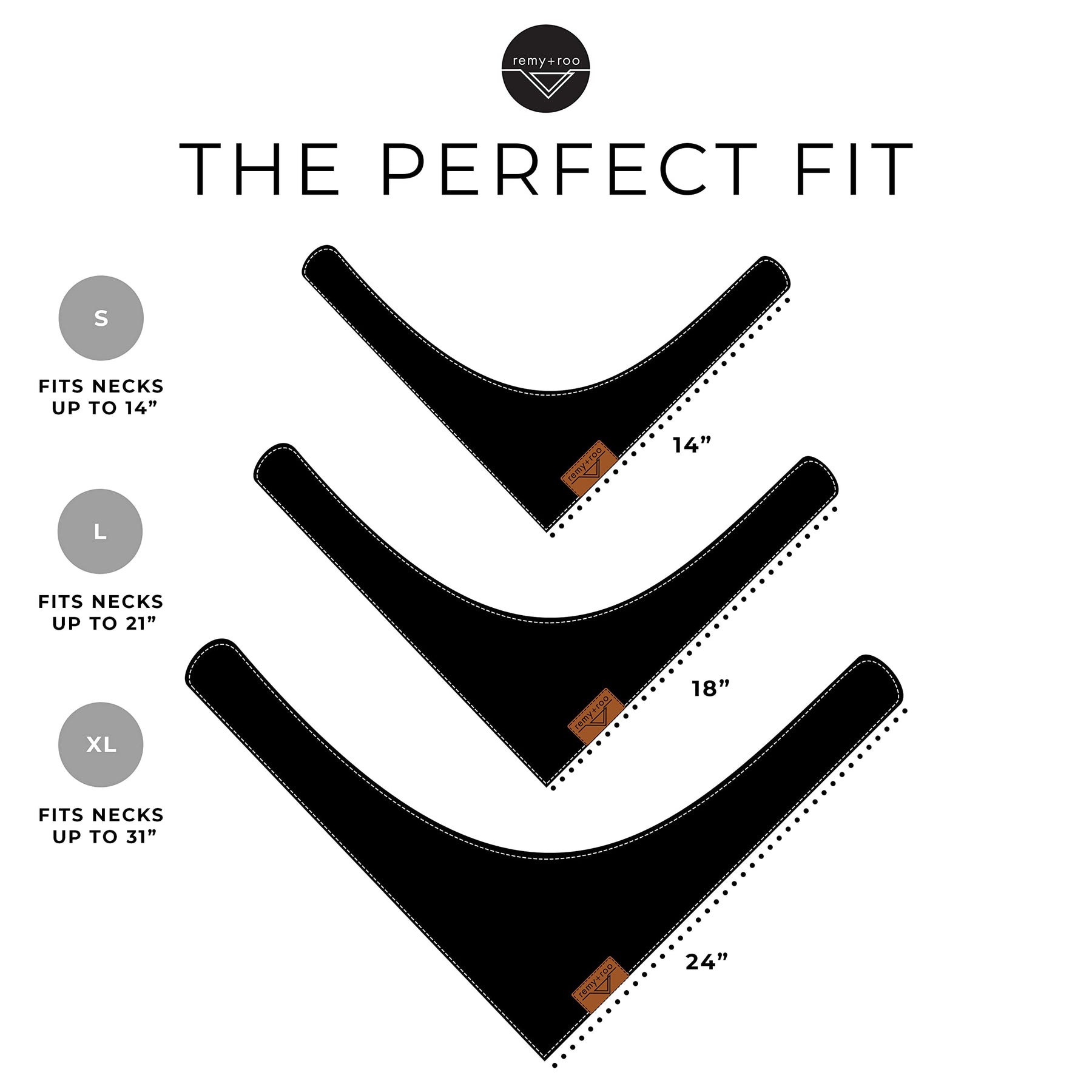 - ADJUSTABLE SIZING: Small fits necks up to 14. Large fits necks up to 21. XL fits necks up to 31. Remy+Roo bandanas have a unique design with two long ends making the dog bandana adjustable to the exact size of your pet's neck. The bandana has a curved design to mimic your dogs natural neck-line. It is designed to fit comfortably while eliminating bulk, folds and excess fabric. Remy+Roo bandanas come in multiple sizes.