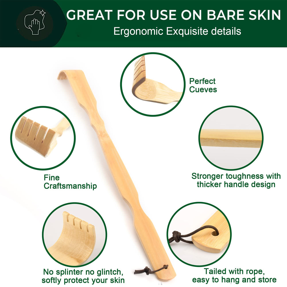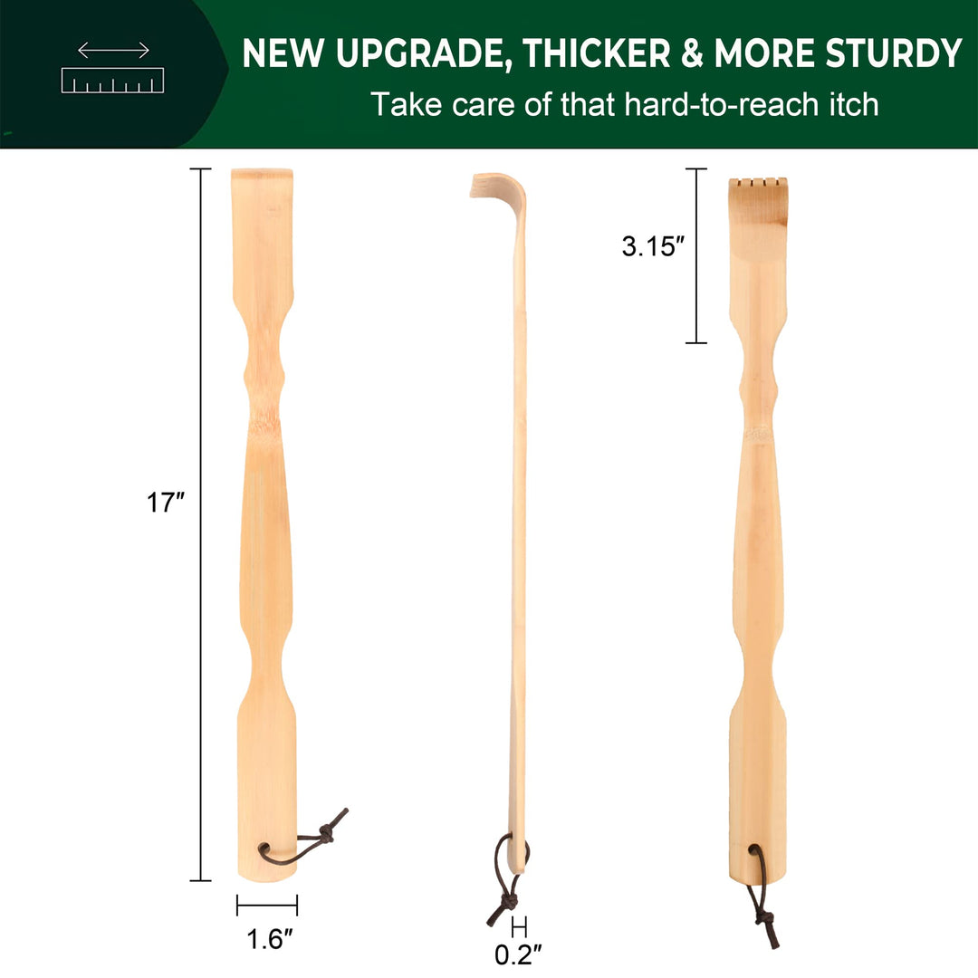 - Laber-Saving Longer HandleThis is a 17“ Long arc-shaped bamboo scratcher, easy to touch the itchy spot that you can't reach conveniently and accurately, no longer need to bend over and scratch your back, and help you get rid of itching troubles. Suitable for pregnant women, elderly, adults, men and women use at home or office, as your perfect craw back scratcher.