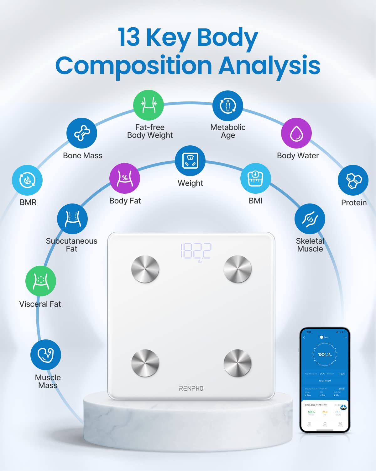 - Convenient & Smart: Just step on RENPHO scale for body weight and you can immediately see the weight data. 13 body key metrics will sync on the App once your phone is connected with Bluetooth. Automatic calibration, automatic on/off.