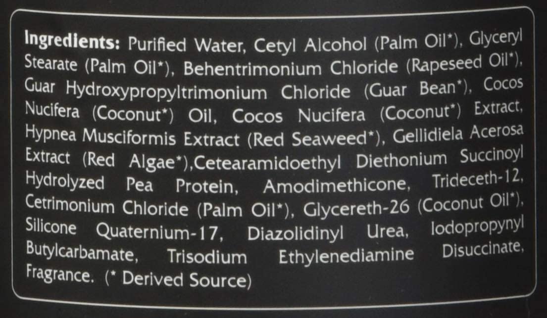 ingredients | Purified Water , Cetyl AlcoholDerived from Palm Oil , Glyceryl StearateDerived from Palm Oil , Behentrimonium ChlorideDerived from Rapeseed Oil , Guar Hydroxypropyltrimonium ChlorideDerived from Guar Bean , Argania Spinosa Kernel OilDerived from Argan , Moringa Oleifera Seed OilDerived from Moringa , Hypnea Musciformis ExtractDerived from Red Seaweed , Gellidiela Acerosa ExtractDerived from Red Alga , Cocos Nucifera ExtractDerived from Coconut Milk , Cetearamidoethyl Diethonium Succinoyl Hydrolyzed Pea Protein , Panthenol , Amodimethicone , Trideceth-12 , Cetrimonium ChlorideDerived from Palm Oil , Glycereth-26Derived from Coconut Oil , Silicone Quaternium-17 , Diazolidinyl Urea , Iodopropynyl Butylcarbamate , Fragrance |