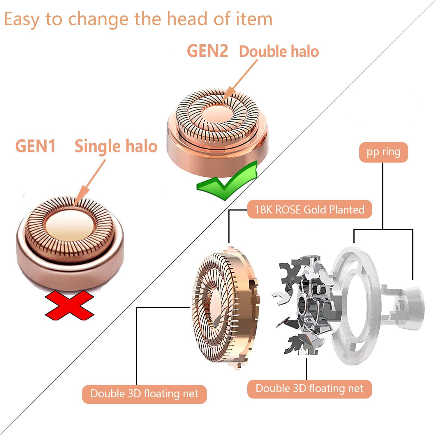 - The best companion for women hair removal Gen 2 replacement heads keep the same 18K gold-plated rose gold workmanship to provide smooth finishing and gentle touch. It fits with Generation 2 electric or battery hair remover. Outstanding performance in erasing unwanted hair on lip, chin, cheeks and sideburns.Its anti-allergic properties suitable for all skins, allows you to remove your facial hair smoother and feel comfortable