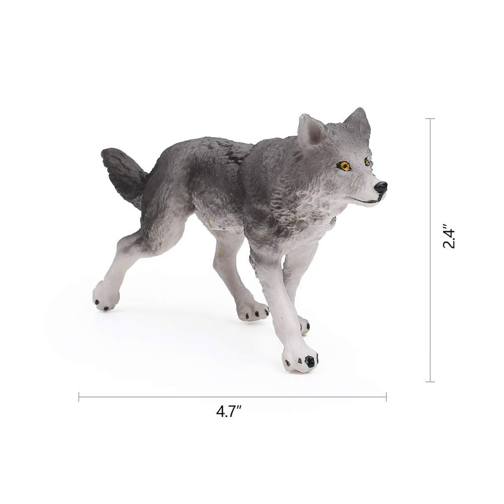 - 7pcs Wolves Toy Figures Set includes: 1 Grey Wolf Standing, 1 Grey Wolf Running, 2 Wolf Hunting, 2 Wolf Howling and 1 Wolf Cub.