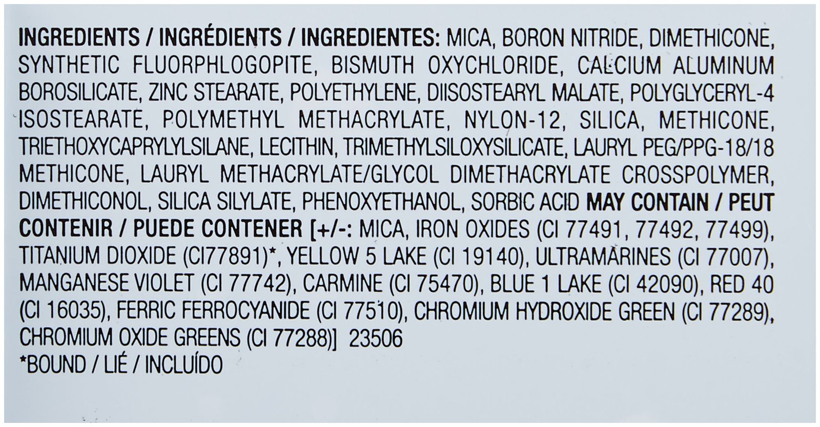 | ingredients | Mica, Boron Nitride, Dimethicone, Synthetic Fluorphlogopite, Bismuth Oxychloride, Calcium Aluminum Borosilicate, Zinc Stearate, Polethylene Diisostearyl Malate, Polglyceryl-4 Isostearate, Polymethyl Methacrylate, Nylon-12, Silica, Methicone, Lecithin, Trimethylsiloxysilicate, Lauryl PEG/PPG-18/18 Methicone, Lauryl Methacrylate/Glycol Dimethacrylate Crosspolymer, Dimethiconol, Silica Silylate, Phenoxyethanol, Sorbic Acid; May contain +/-: Mica, Iron Oxides (CI 77491, 77492, 77499), Titanium Dioxide (CI 77891), Yellow 5 Lake (CI 19140), Ultramarines (CI 77007), Manganese Violet (CI 77742), Carmine (CI 75470), Blue 1 Lake (CI 42090), Red 40 (CI 16035), Ferric Ferrocyanide (CI 77510), Chromium Hydroxide Green (CI 77288), Chromium Oxide Greens (CI 77289) |