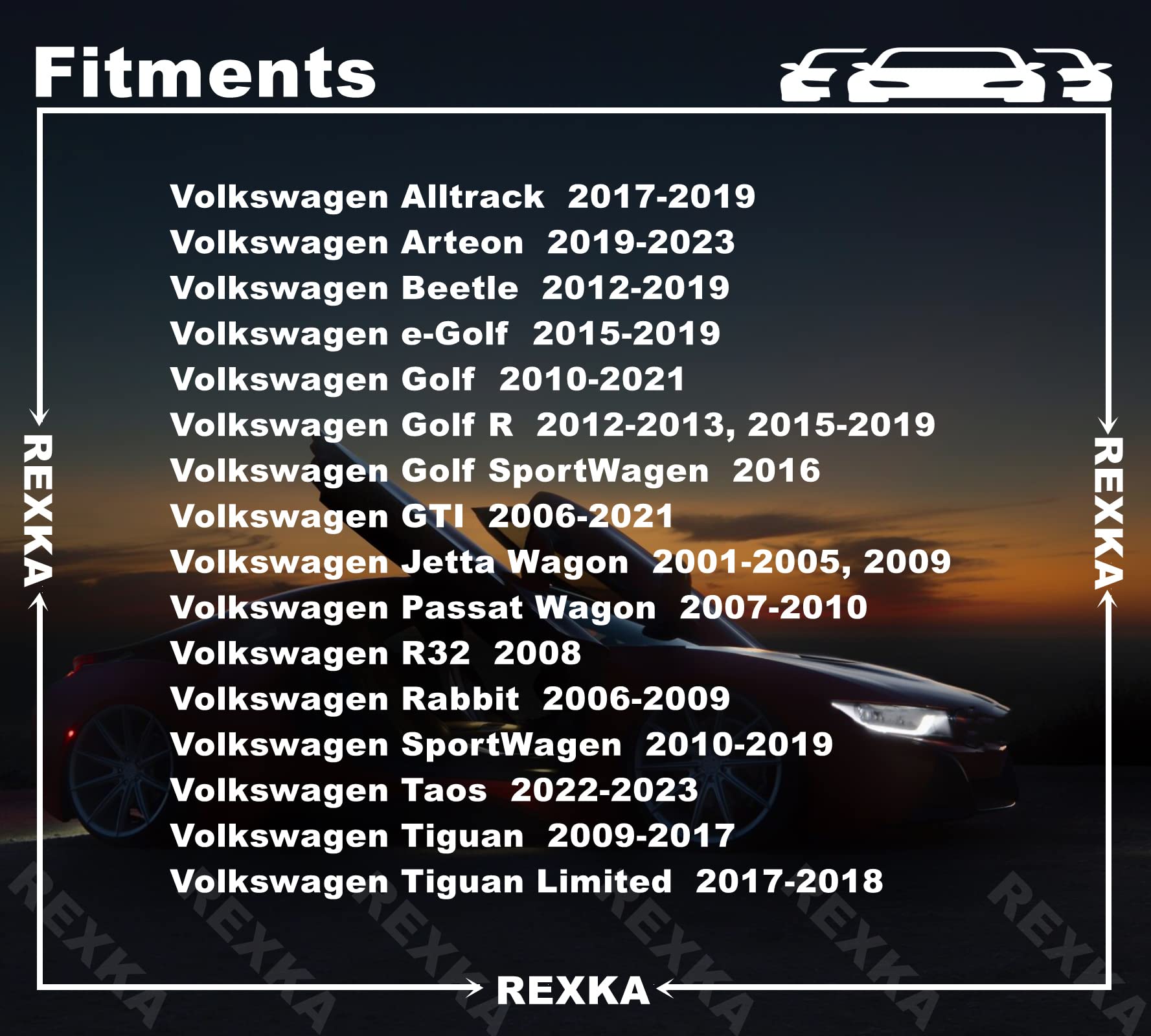- Applications: Beetle 2012-2017, e-Golf 2015-2017, Golf 2010-2017, Golf R 2012-2013 2015-2017, GTI 2006-2017, Jetta Wagon 2001-2005 2009, Passat Wagon 2007-2010, R32 2008, Rabbit 2006-2009, SportWagen 2010-2014, Tiguan 2009-2017
