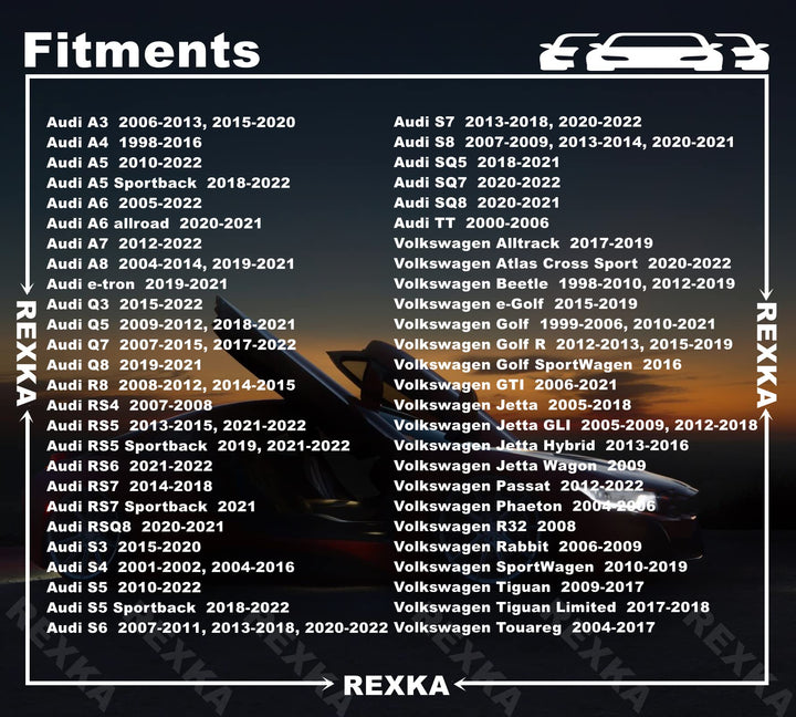 - Fits: Audi: A3, A3 Quattro, A4, A4 Quattro, A5, A5 Quattro, A5 Sportback, A6, A6 Quattro, A7 Quattro, A8 Quattro, e-tron Quattro, Q3, Q3 Quattro, Q5, Q7, Q8, R8, RS4, RS5, RS5 Sportback, RS7, S3, S4, S5, S5 Sportback, S6, S7, S8, SQ5, TT, TT Quattro