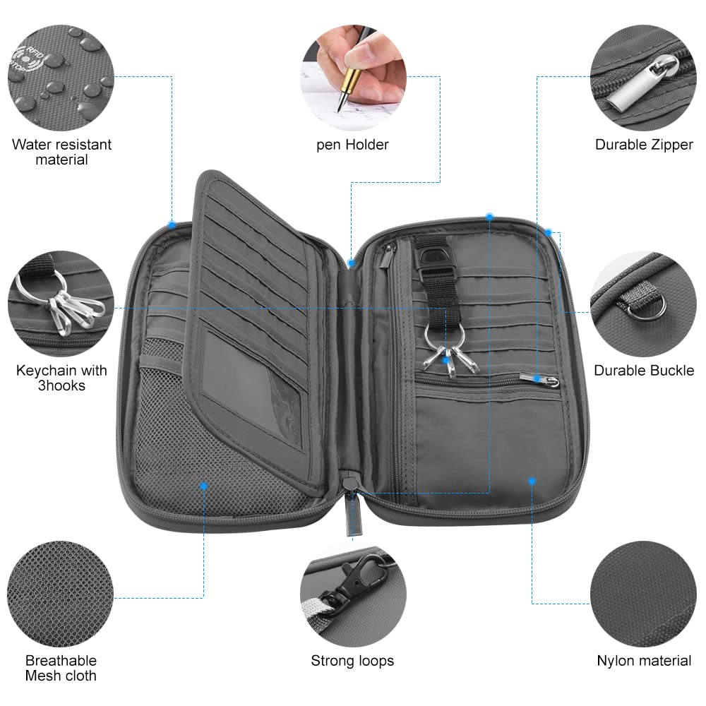 - LARGE CAPACITY ORGANIZERThe RFID Universal Travel Passport Wallet organizer with RFID essentials well, Storing 5 * Passport holder, 1 * brochure, 9 * Credit Cards, Keychain with 3 hooks, Boarding Card, Tickets, ID Card, Coins, loose money, License, other documents, etc. Large zipper pocket for cash and pen slot on the middle, Front Pockets could easy access to phone/boarding cards, which makes your journey convenient and comfortable.