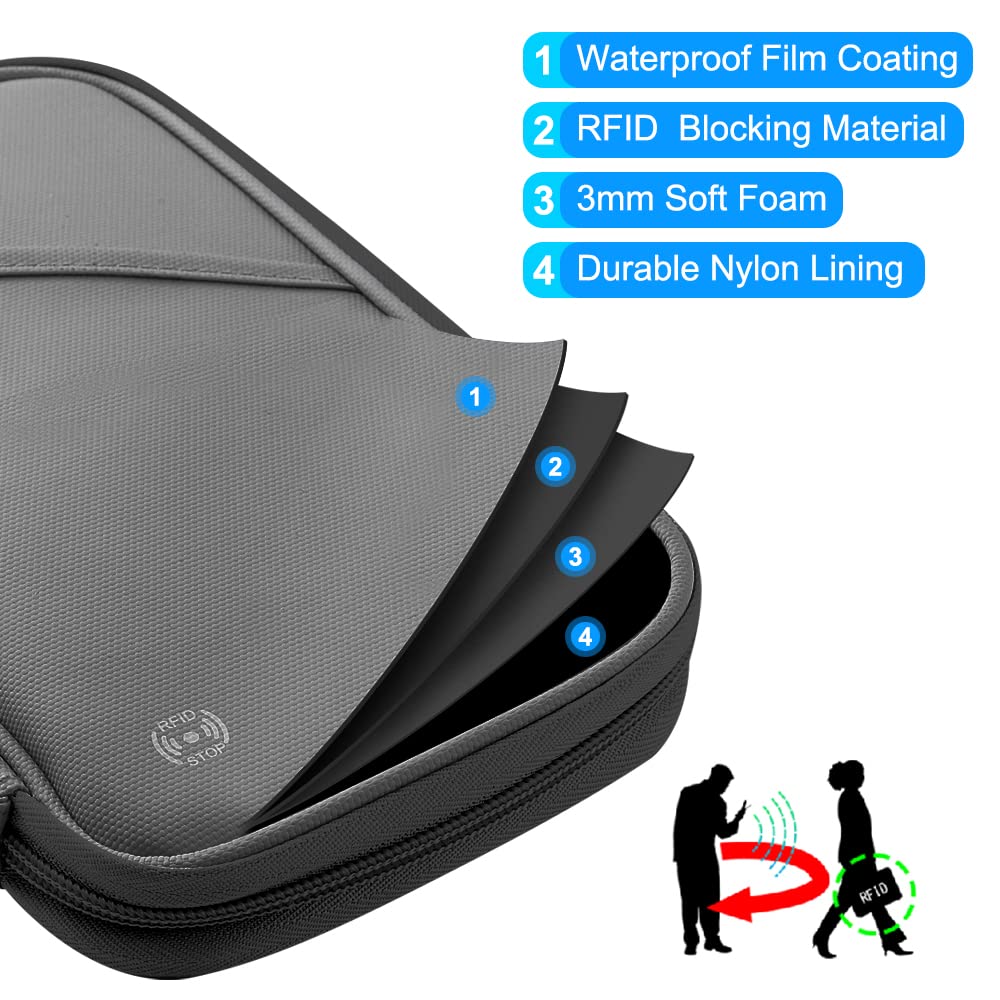 - RFID BLOCKINGThe RFID blocking technology could effectively protect your card from being scanned. Built-in material safeguards your personal information, such as ID card, Driver's License, Credit/Debit card. The RFID travel passport wallet will meet all your travel needs, which is a great ideal for women and men. Perfect fit for traveling, home, camping, business trip.