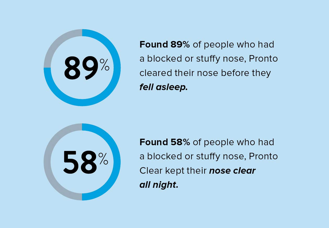 - Found 58% of people who had a blocked or stuffy nose, Pronto clear kept their nose clear all night