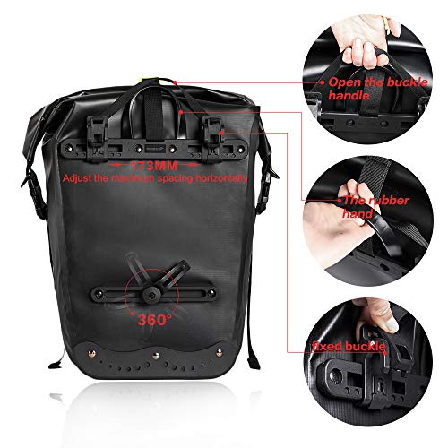 - Fully Waterproof: Made of 1000D polyester material with waterproof PVC layer on both sides, this bike pannier is super durable and fully waterproof, as well as anti-tear, wear resistant and heat resisting, protecting your items perfectly.