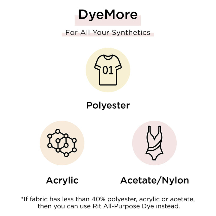 - Dye synthetic fabric and fabric blends, which include anything with 35% or more polyester, acrylic, acetate or nylon. Perfect for rejuvenating faded clothing, upcycling, hiding laundry accidents and so much more
