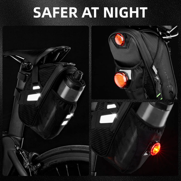 - TWO TAILLIGHT LOOPS: Reflective on bottle holder pocket and two available taillight loops. A small tail light can also be mounted on the back of the saddle bag for enhanced safety and visibility. (The tail light&water bottle don't include in the package).