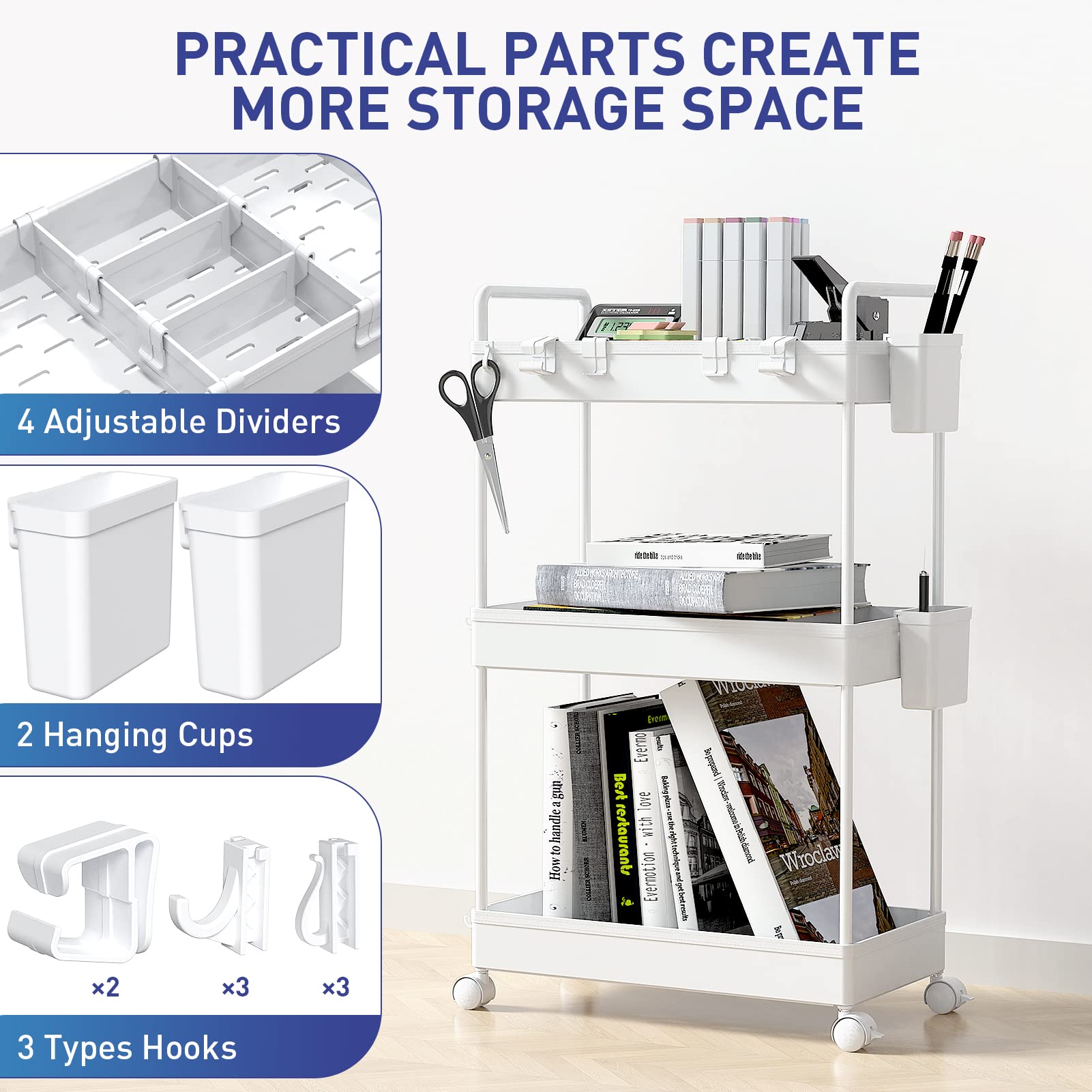 - 2 Hanging Cups & 3Types of Hooks & 4 Dividers: This 3 tier utility rolling cart is equipped with extra 2 hanging cups, 3 types of hooks and 4 dividers. The removable storage cups provide extra storage space to organize your small objects. The adjustable dividers help easily adjust compartment space to meet your special needs, great to optimize space utilization. The moveable side hook are convenient for hanging different small items