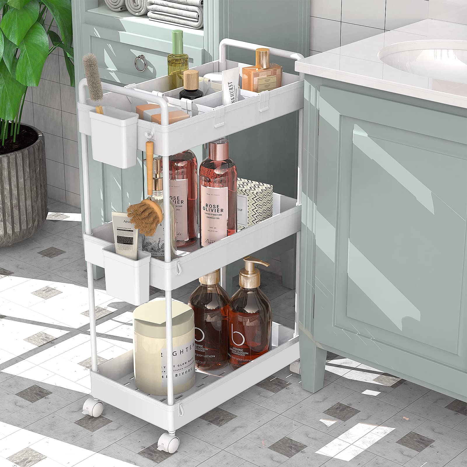 - Original Storage Carts – Slim Storage Cart, 3 Tier Utility Rolling Cart with Wheels Lash Cart Organizer Small Slide Out Mobile Storage Cart with Hanging Cup Divider for Bathroom Laundry Room Kitchen Narrow Place, White by Ronlap