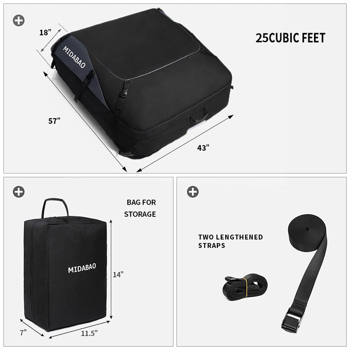 - 25 Cubic Feet - Roof Top Carrying Bags - The whole point of the purchase us to provide additional cargo room, so it makes no point to buy one that is not big enough. the roof bag overall size is 57'' x 43'' x 18'', Carry 25 cubic feet. Larger than other brand.