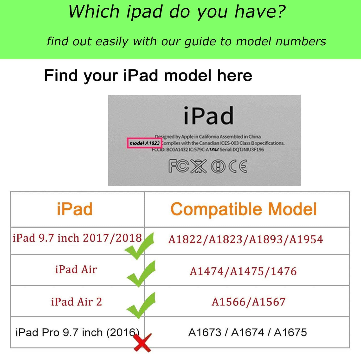 - Compatibility modelsSpecail fit for iPad 9.7 inch 2018 2017/ iPad Air 2 Case/ iPad Air Case Suit for iPad 9.7 2018 6th Gen (A1893/A1954), iPad 9.7 2017 5th Gen (A1822/A1823), iPad Air 2 (A1566/A1567), iPad Air (A1474/A1475/A1476).