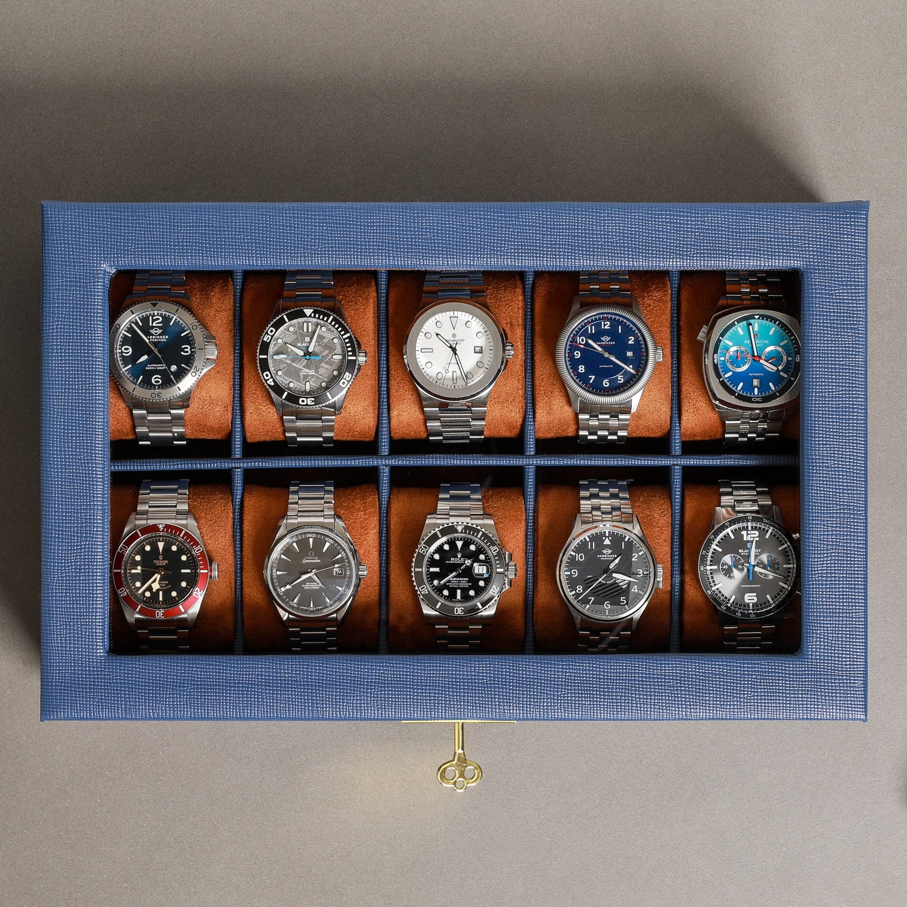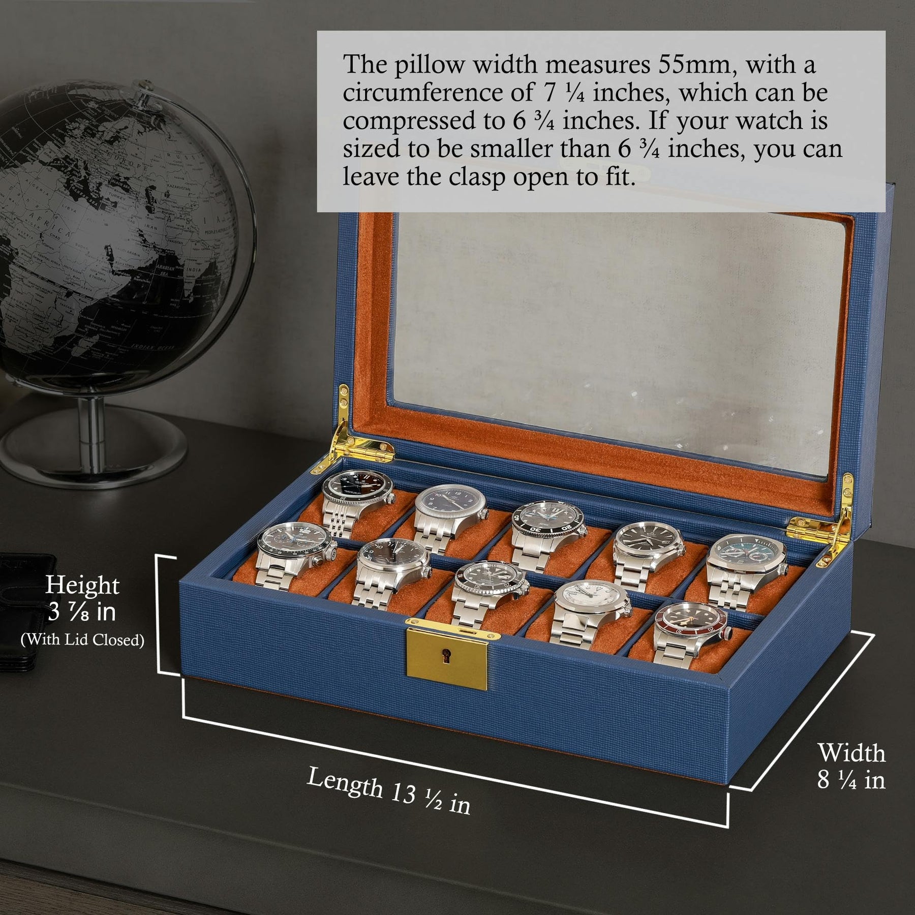 - Original Cabinets & Cases – 10 Slot Leather Watch Box - Luxury Watch Case Display Jewelry Organizer - Locking Watch Display Case Holder with Large Glass Top - Watch Box Organizer for Men and Women (Blue/Tan) by ROTHWELL