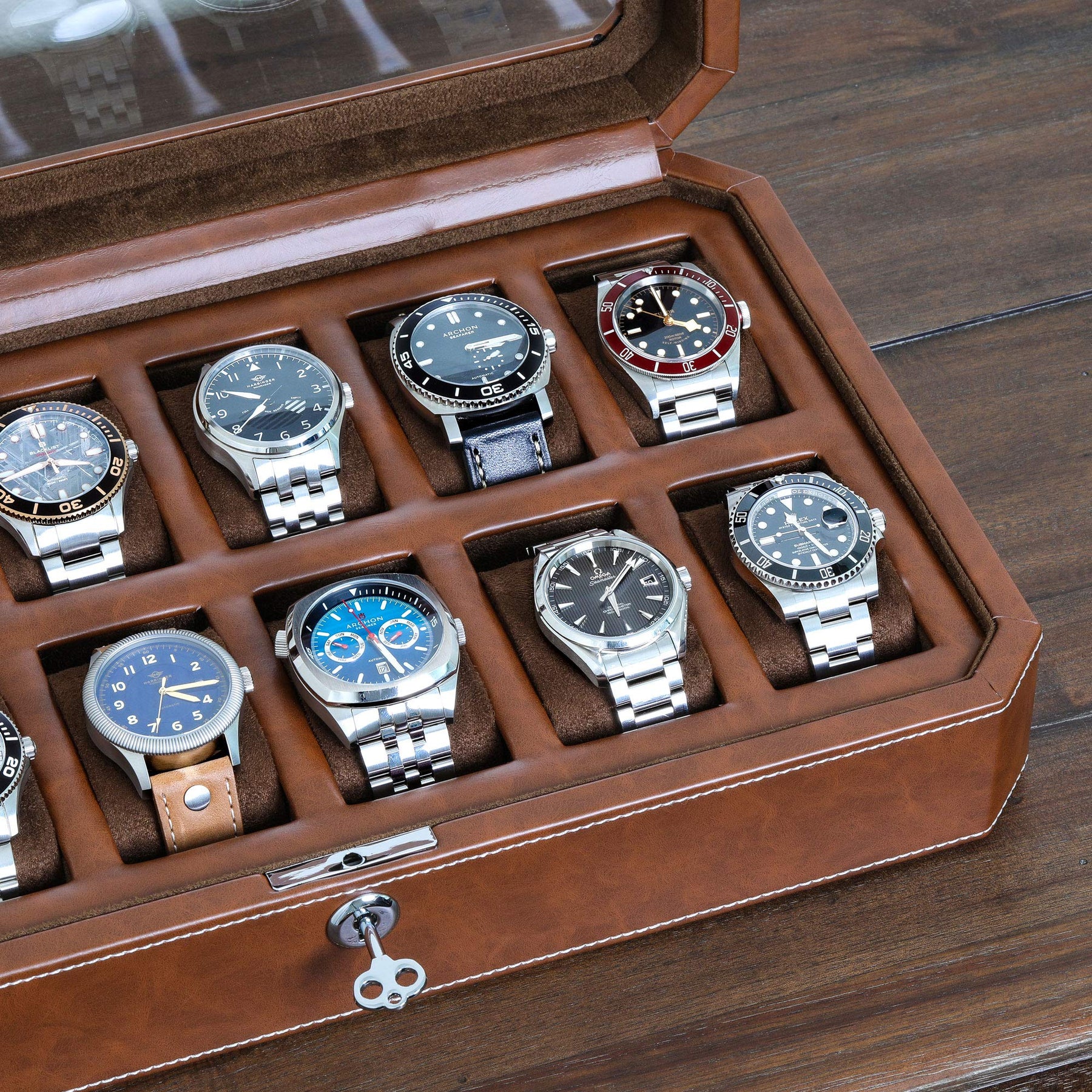 - Original Cabinets & Cases – 12 Slot Leather Watch Box - Luxury Watch Case Display Organizer, Microsuede Liner, Locking Mens Jewelry Watches Holder, Men's Storage Boxes Holder Large Glass Top (Tan/Brown) by ROTHWELL
